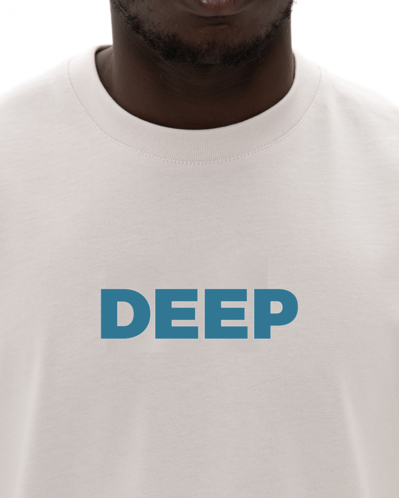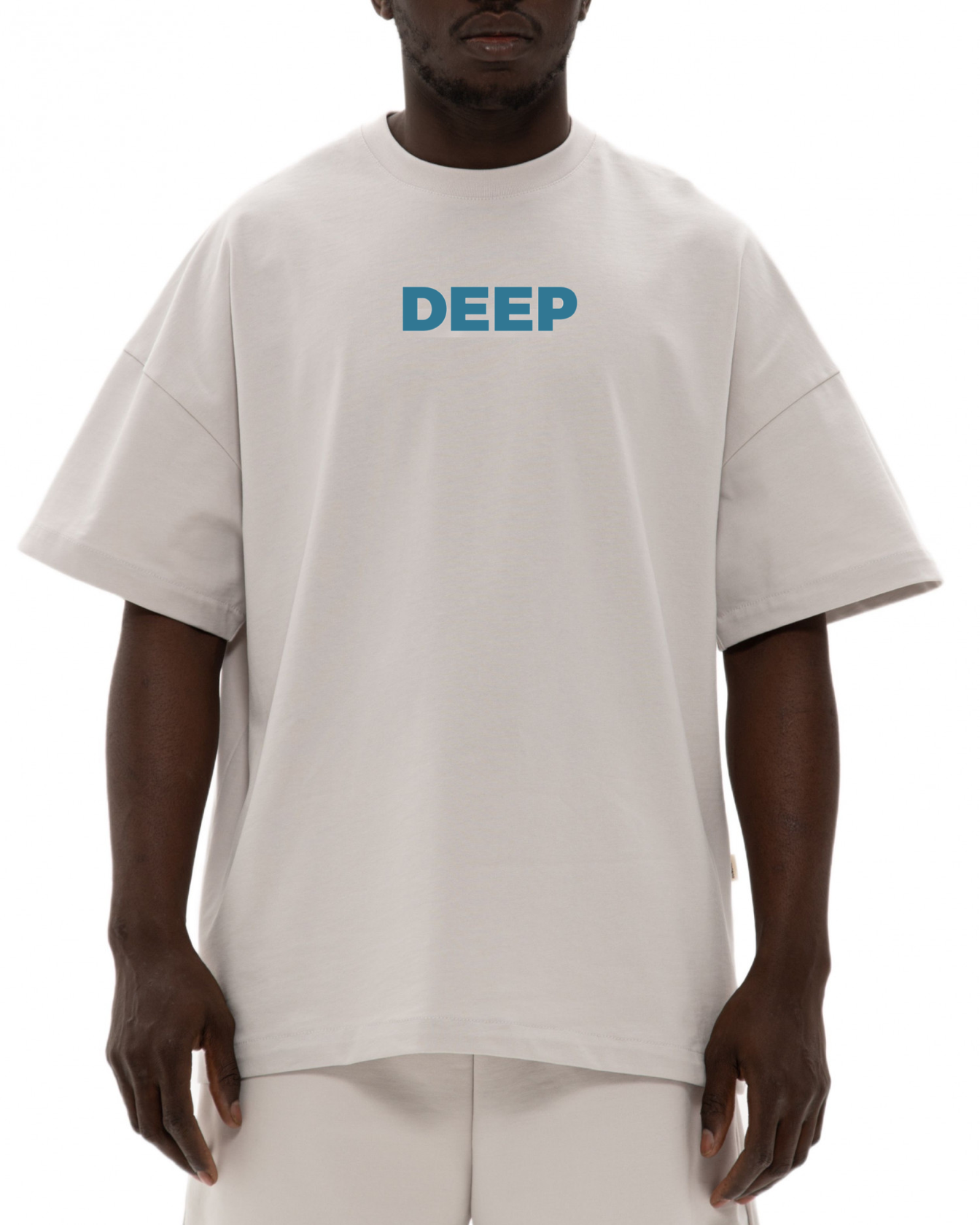 Футболка силуэта оверсайз с рукавом 1/2 выполнена из 100% хлопка. Спущенная линия плеча, оригинальный принт DEEP.